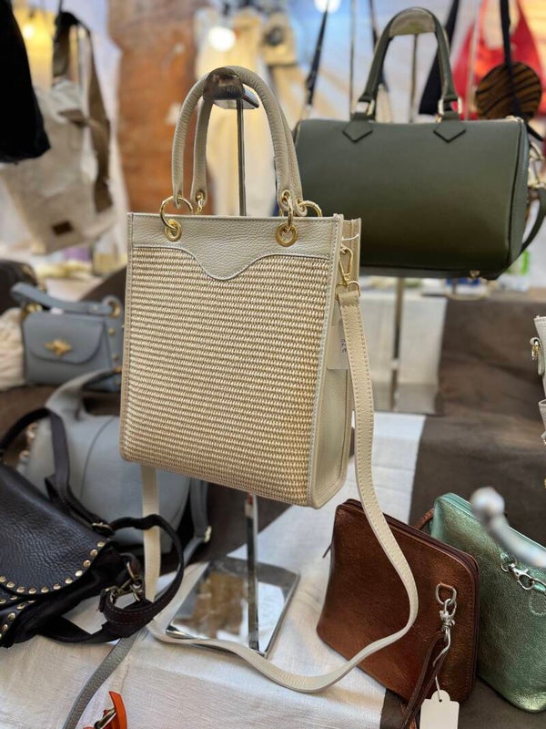 Borsa sia a mano che a tracolla, in rafia e pelle